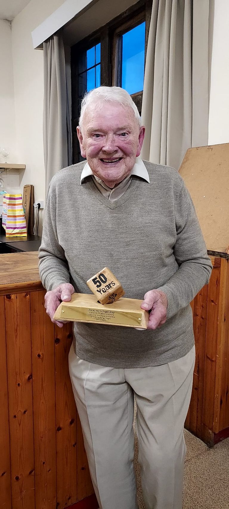 This year our longest serving choir member, Roger Bray, clocked up 50 years and we celebrated this major milestone with Roger at the AGM (see photo). The choir continues to benefit from Rogers' lovely baritone singing voice and our concerts are very often enlivened when Roger performs one of his comic monologues. Congratulations Roger.